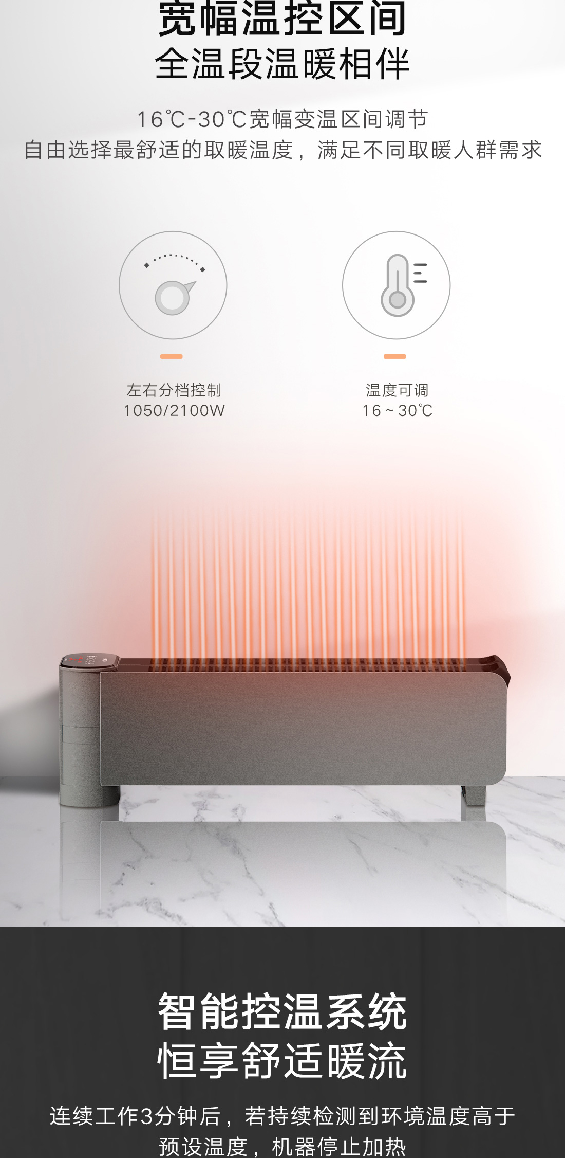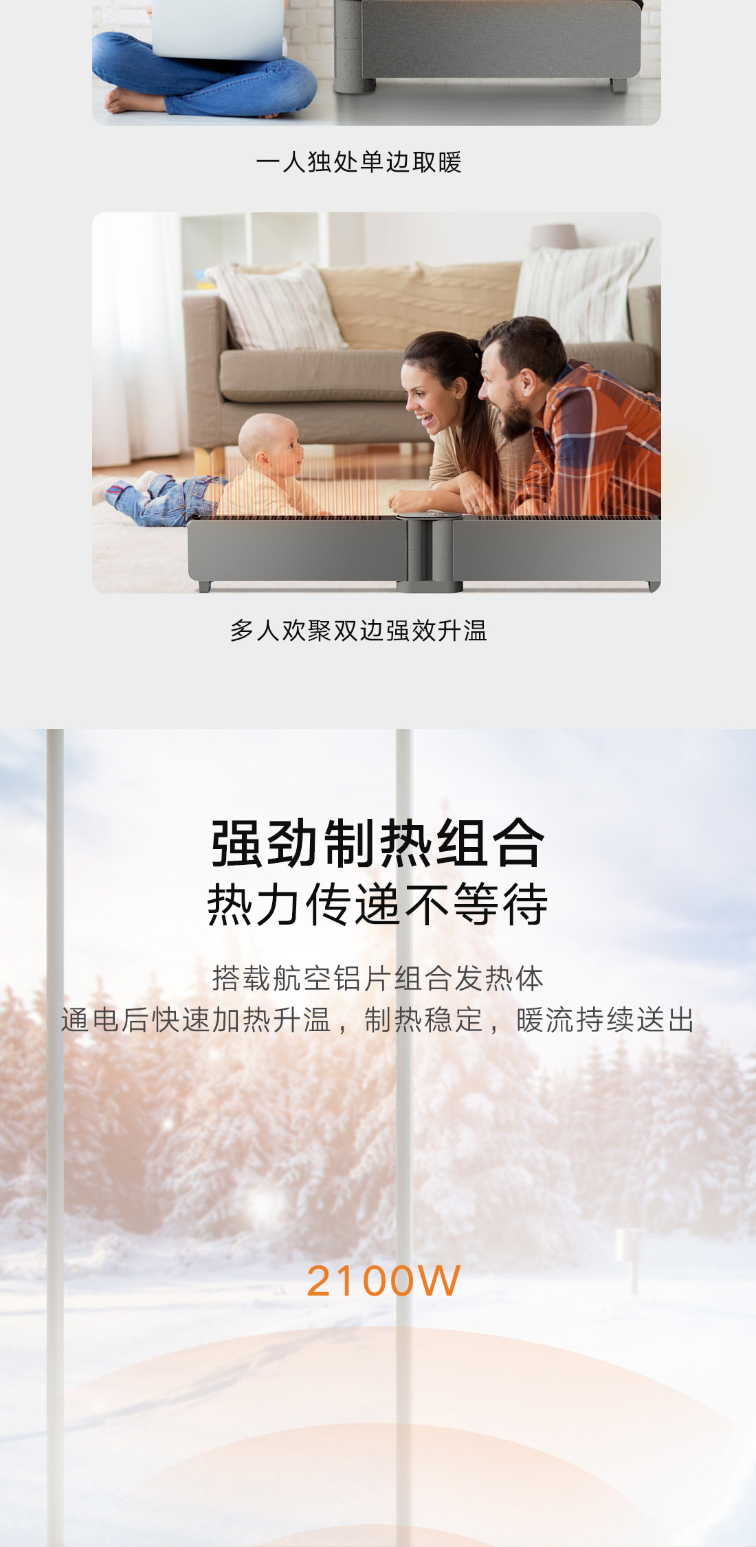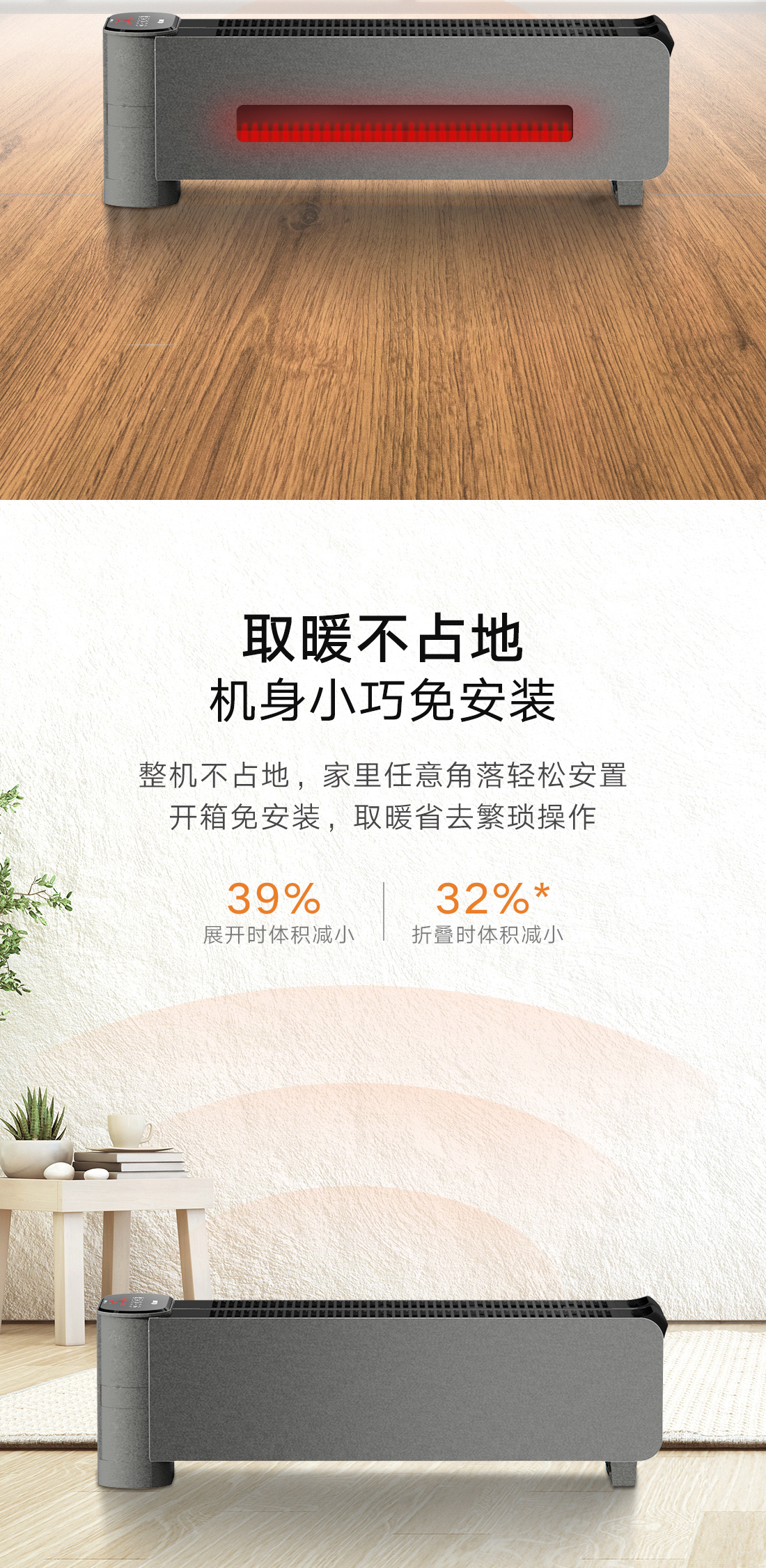 小体积设计,移动轻巧不占地;全屋升温,取暖舒适。