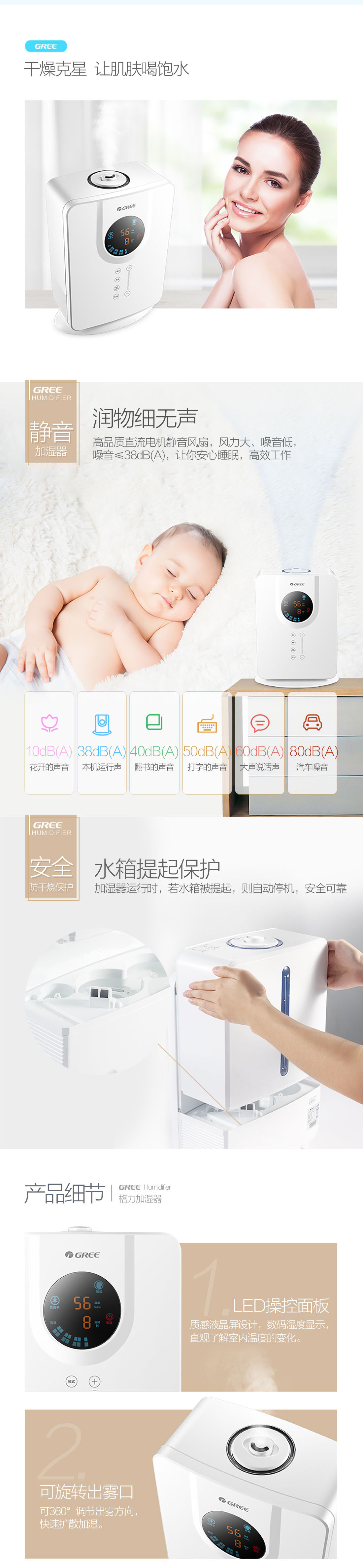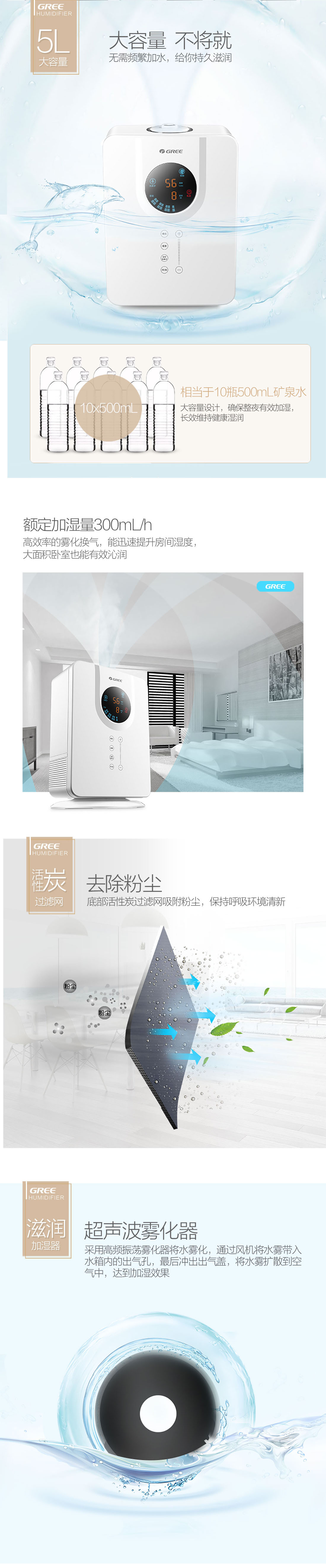 大容量5L水箱;智能恒湿技术;3种加湿模式;香薰加湿
